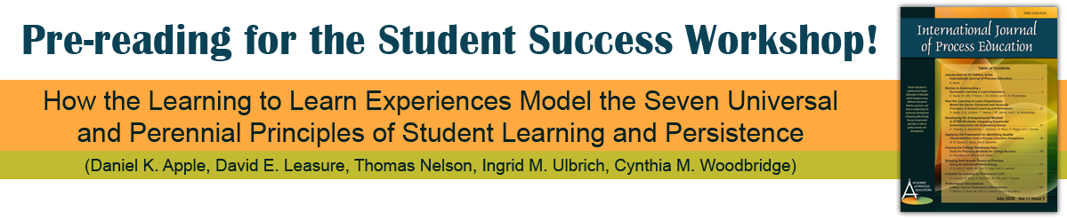 The Tentative Conference Program is available now on the Academy Conference webpage. The final conference program and the PE Conference Support Site (a Moodle "course" on the Member's Site) containing all of the detailed information about presenters, sessions and materials will be available by May 10th or before. The Conference will kick off with a Pre-Conference Student Success Workshop followed by a pizza dinner and “Process Education in a Nutshell” orientation.